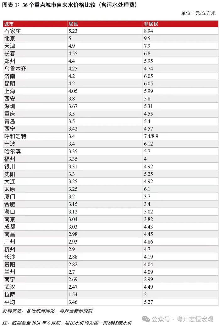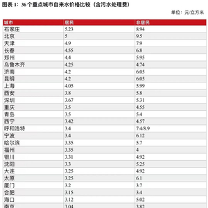 分部门看,居民水价低于非居民水价。我国按照居民生活用水保本微利、其他用水合理盈利原则定价,从定价程序上保障居民用水价格低于非居民用水价格。截至2024年6月底,全国36个重点城市的非居民用水平均价格为5.27元/立方米,居民第一阶梯平均水价为3.47元/立方米,是非居民用水价格的65.8%。