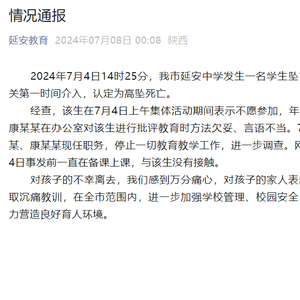 延安市教育局通报学生坠亡事故:两教师批评教育该生时言语不当被撤职调查