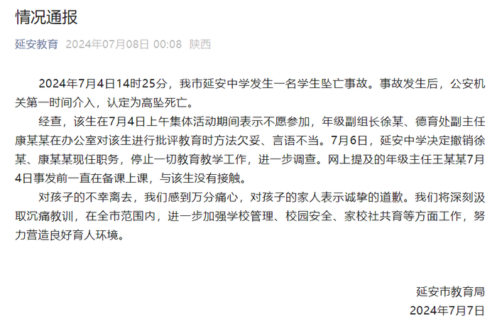 经查,该生在7月4日上午集体活动期间表示不愿参加,年级副组长徐某、德育处副主任康某某在办公室对该生进行批评教育时方法欠妥、言语不当。7月6日,延安中学决定撤销徐某、康某某现任职务,停止一切教育教学工作,进一步调查。网上提及的年级主任王某某7月4日事发前一直在备课上课,与该生没有接触。