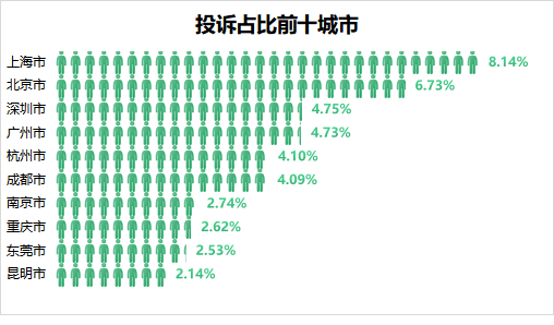 针对投诉地域分布进行分析,上海市以8.14%的投诉比例位居榜首。紧随其后的是北京市和深圳市,分别以6.73%和4.89%的投诉比例位列第二和第三。广州市的投诉比例为4.75%,位列第四。