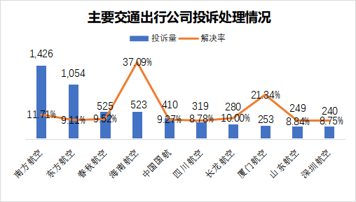 其次是东方航空和春秋航空,投诉量分别排名第二和第三,投诉解决率分别为9.11%和9.52%。此外,海南航空、中国国际航空及四川航空等公司也呈现出较高的投诉量。