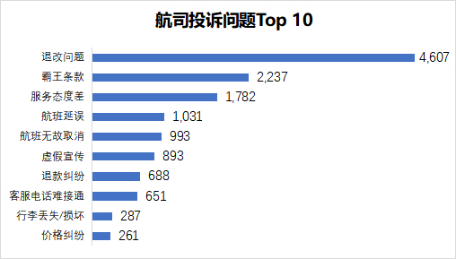 在各类投诉中,退票和改签问题尤为突出,投诉量达到4,607件。紧随其后的是霸王条款问题,共收到2,237件投诉,反映出消费者对航空公司服务条款的不满。