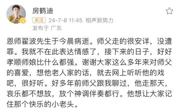 翟波唯一的弟子,相声、二人转演员房小满(艺名房鹤迪)表示,师父走得很安详,他希望大家永远记得他是那个快乐的小老头老翟头,“谢谢大家这么多年来对师父的喜爱,想他老人家的话,就去网上听听他的戏吧,很好听。好多年前师父跟我聊过,他走那天,哀乐都不想放,放个神调伴奏都行。他想让大家记住那个快乐的小老头。”