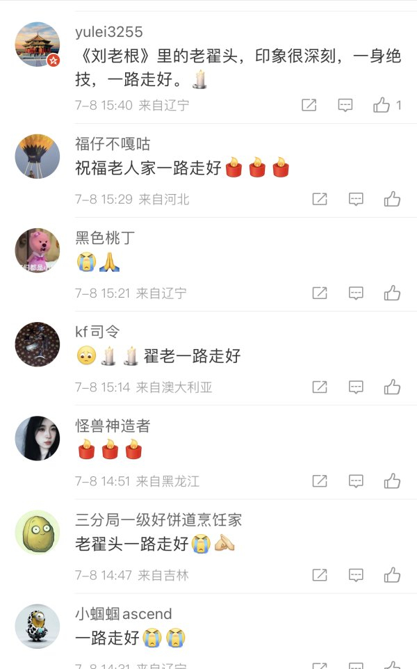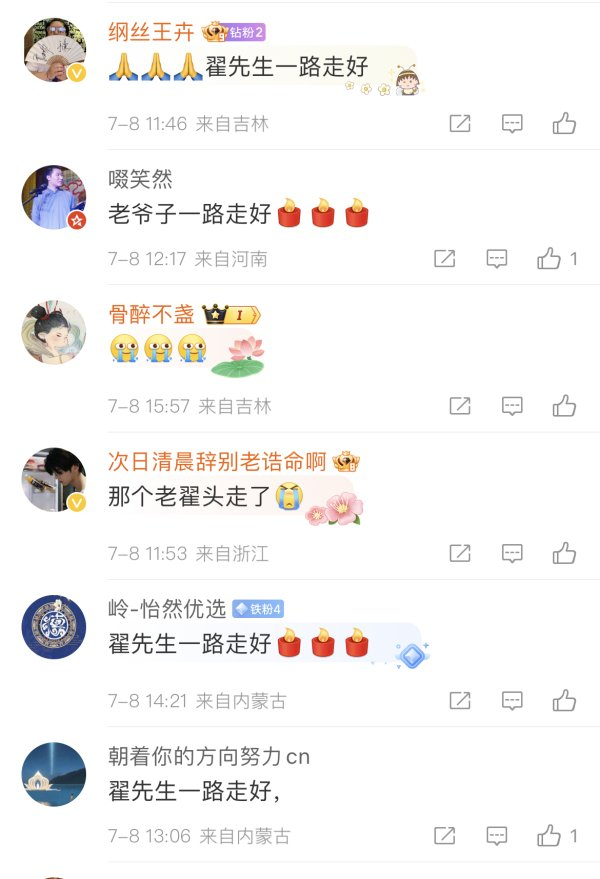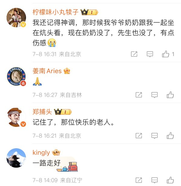 来自五湖四海的网友也纷纷寄托哀思,希望给自己带来过无数快乐的老翟头一路走好。
