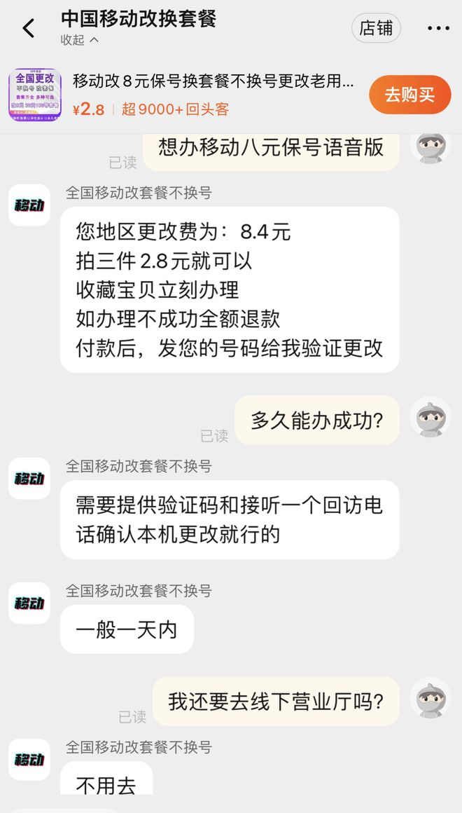 陈先生上网搜索后发现,已有不少人办理了8元套餐,于是尝试在淘宝和闲鱼搜索,发现居然有不少“中国移动8元套餐代办服务”,“我抱着试一试的心态就找了代办,代办费是5.9元,他们找我要了一个手机号码和验证码,说1-2天就能办理好”。