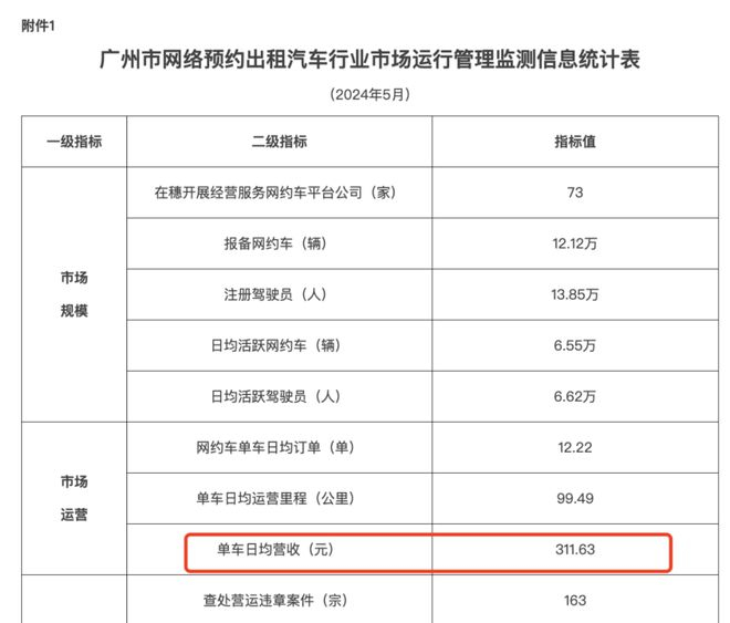 据《广州市网络预约出租汽车市场运行管理监测信息月报》数据显示,从2023年9月至2024年5月,广州报备网约车数量从9.74万辆增至12.12万辆,注册驾驶员从12.91万增至13.85万;与此同时,从去年12月到今年5月,网约车日均订单量则从14.21单下降至12.22单,日均营收也从343.34元降至311.63元。
