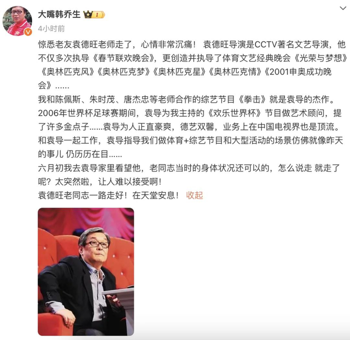7月8日中午12时许,央视知名主持人韩乔生发文,称曾多次执导央视春晚的导演袁德旺去世。