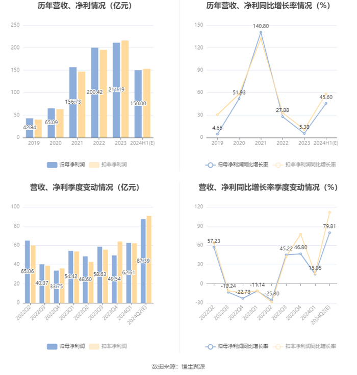 紫金矿业(601899)7月8日晚间披露业绩预告,预计2024年上半年归母净利润145.5亿元至154.5亿元,同比增长41%-50%;扣非净利润预计148.5亿元至157.5亿元,同比增长54%-63%。以7月8日收盘价计算,紫金矿业目前市盈率(TTM)约为18.67倍-19.33倍,市净率(LF)约4.4倍,市销率(TTM)约1.67倍。