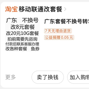 澎湃新闻记者通过淘宝网搜索“移动8元套餐更改”,出现了不少标题为“不换号,改套餐”的链接,有店铺显示已经销售10万+。