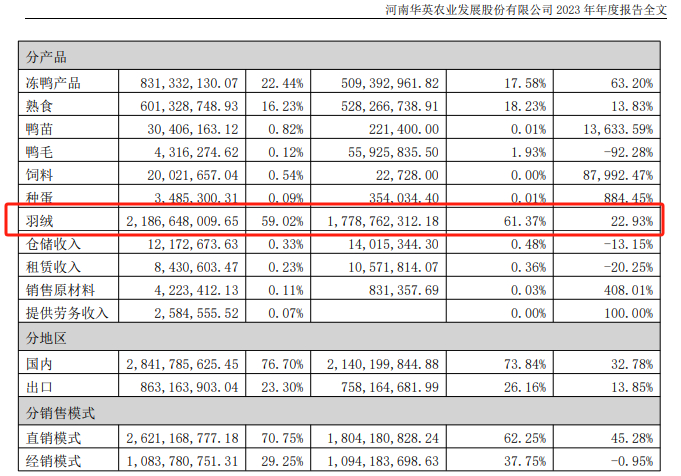 分产品看,羽绒产品占比最大,华英农业全年销售羽绒产品7111.90吨,实现营业收入21.87亿元,同比增长22.93%,毛利率同比提升1.69个百分点,占总营收59%。
