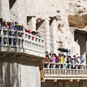 题图说明:游客排队参观敦煌莫高窟洞窟。