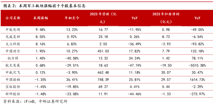 本周军工板块涨幅前十的个股为:中航电测(+9.48%)、光威复材(+8.55%)、大立科技(+8.16%)、中国动力(+1.95%)、铂力特(+1.40%)、航天发展(+0.68%)、中航沈飞(+0.12%)、中国船舶(-1.35%)、宝钛股份(-1.45%)、新研股份(-1.48%)。