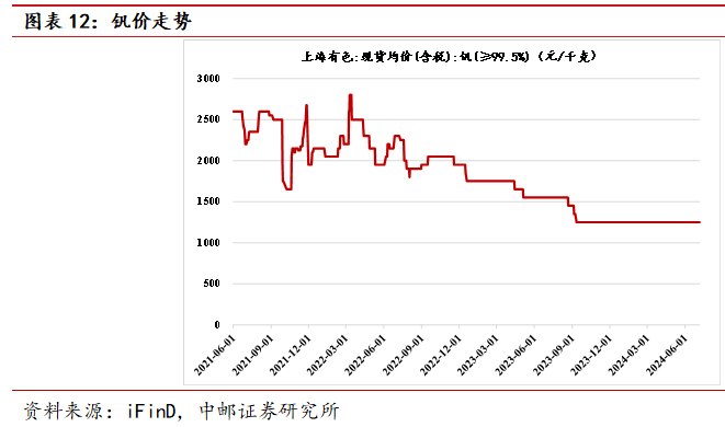 钛合金的原材料成本构成中,海绵钛占比约60%,中间合金占比30%-40%,由于金属钒价格相对较高,铝钒合金价格变化主要受钒价变化的影响。