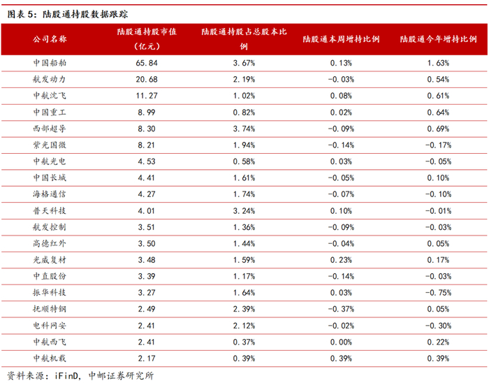 当前陆股通持有市值最多的军工标的为中国船舶(65.84亿元)、航发动力(20.68亿元)、中航沈飞(11.27亿元);持股比例最高的军工标的为西部超导(3.74%)、中国船舶(3.67%)、普天科技(3.24%)。