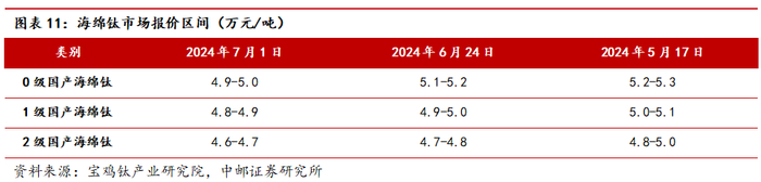 海绵钛价格跟踪:宝鸡钛产业研究院7月1日给出海绵钛市场报价区间:0级国产海绵钛价格4.9-5.0万元/吨;1级国产海绵钛价格4.8-4.9万元/吨;2级国产海绵钛价格4.6-4.7万元/吨。近期,海绵钛报价小幅下滑。