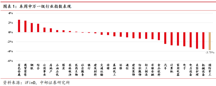 本周中证军工指数下跌3.37%,申万军工指数下跌3.75%,上证综指下跌0.59%,深证成指下跌1.73%,沪深300指数下跌0.88%。军工板块在31个申万一级行业中涨幅排第31位。