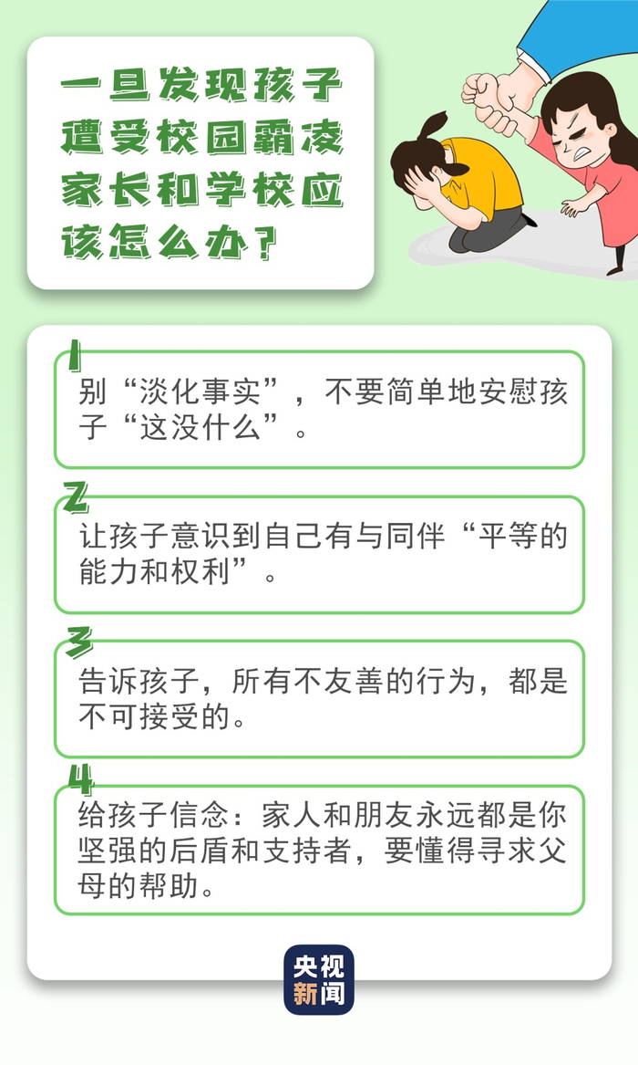 今年5月,教育部办公厅印发通知,对各地开展的校园暴力与学生欺凌防范治理专项行动提出具体工作要求,明确各校要成立学生欺凌治理委员会,对欺凌行为进行认定,依法依规进行处理;要公布欺凌防治电话、邮箱和法治副校长、分管安全工作校领导电话,对来电反映情况落实首问负责制度。