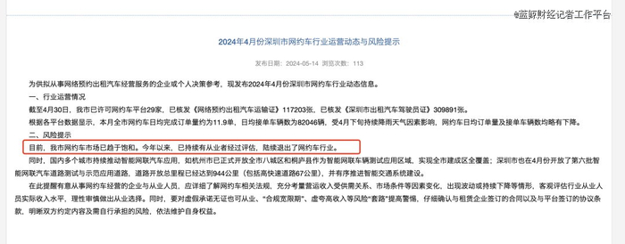 今年4月,深圳市交通运输局发布网约车行业运营动态与风险提示,并表示深圳网约车市场已趋于饱和,近年来,已陆续有从业者经过评估退出深圳市网约车行业。提醒有意从事网约车经营的企业与从业人员,应详细了解网约车相关法规,做好市场调研,充分考量营运收入受供需关系、市场条件等因素变化,出现波动或持续下降等情形,客观评估行业从业人员实际收入水平,理性审慎作出从业选择。