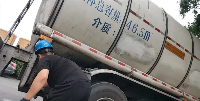 天津一家生产食用油的公司门口,一名罐车司机正在擦拭卸油口。许多罐车不洗罐的话,司机都会通过擦拭卸油口来应付检查。图源:新京报