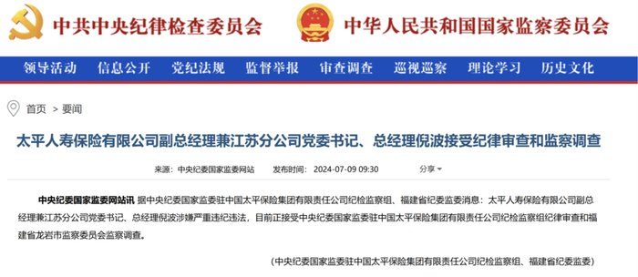 7月9日上午,中央纪委国家监委官网通报,太平人寿保险有限公司副总经理兼江苏分公司党委书记、总经理倪波涉嫌严重违纪违法,目前正接受中央纪委国家监委驻中国太平保险集团有限责任公司纪检监察组纪律审查和福建省龙岩市监察委员会监察调查。