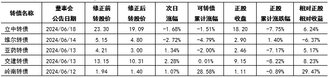 本年度累计85只可转债完成转股价下修,已远远超过2023年全年。以董事会公告日当日、前5日及前10日为基准测算,截止目前,下修博弈的静态投资收益平均分别为0.13%、1.82%和0.06%(注:剔除已退市转债),静态收益环比大幅下降,主要系近期部分低价转债受市场影响而大幅下跌。下修博弈策略应建议应以T-5日进行转债投资,以下修变动日当日进行全部减持,今年以来全部85只下修可转债的平均收益为5.15%,平价持仓时间仅26天,投资收益较高且持续稳定。经统计,今年以来下修博弈胜率为82.5%,但仍需关注下修风险,加强对正股及信用风险的投研。