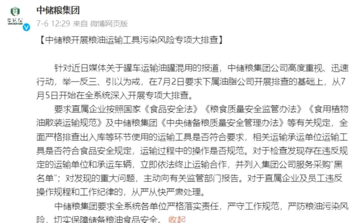 7月6日,中储粮集团公开回应,称要在全系统深入开展专项大排查。对于检查发现存在违反规定的运输单位和承运车辆,立即依法终止运输合作,并列入集团公司服务采购“黑名单”。