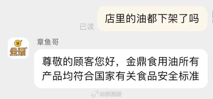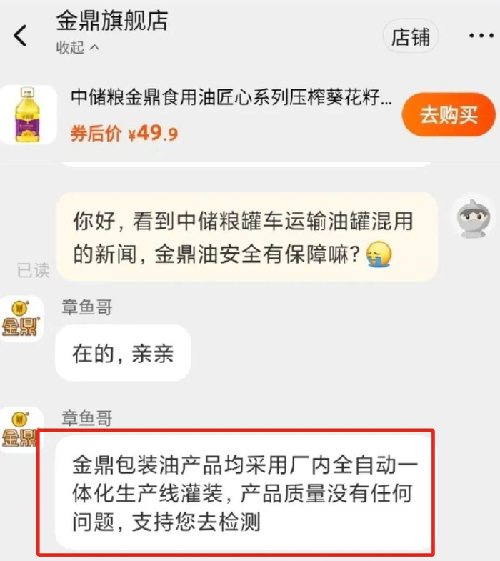 当记者再次追问,客服回复称,“尊敬的顾客您好,金鼎食用油所有产品均符合国家有关食品安全标准”“支持您去检测”。