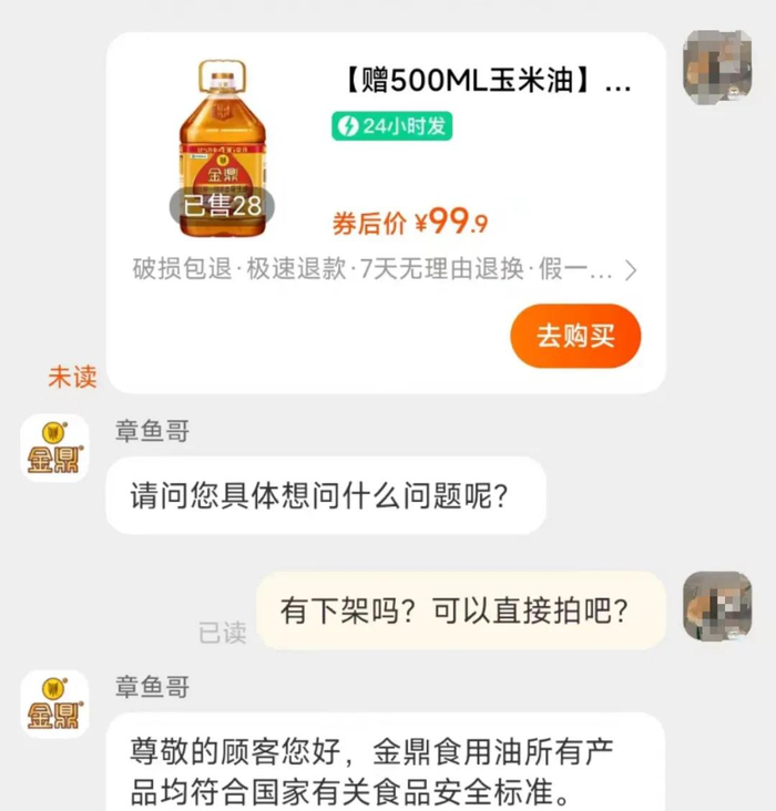 7月8日晚,据读特新闻报道,记者前往京东平台进行检索,发现金鼎食用油京东自营旗舰店内相关食用油产品依然可以正常购买。不过,在店铺售卖页面中并无“联系客服”的入口,疑似店方关闭了客服渠道。