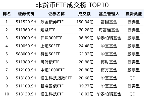 截至今日收盘,政金债券ETF、短融ETF、沪深300ETF成交额居市场前列,分别达150.34亿、70.28亿、36.89亿。宽基类ETF共计4只,分别是沪深300ETF、上证50ETF、科创50ETF、中证1000ETF。行业主题类ETF共计2只,分别是恒生科技指数ETF、恒生科技ETF。
