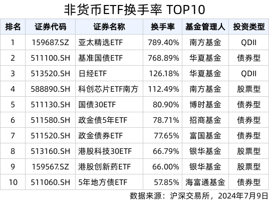 截至今日收盘,亚太精选ETF、基准国债ETF、日经ETF换手率居市场前列,分别达789.40%、768.89%、126.18%。宽基类ETF仅1只:日经ETF。行业主题类ETF共计4只,分别是亚太精选ETF、科创芯片ETF南方、港股科技30ETF、港股创新药ETF。