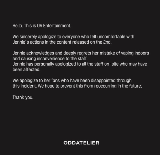 随后,Jennie个人厂牌OA娱乐发声明回应室内吸电子烟争议,表示Jennie已经亲自向所有可能受到影响的现场工作人员道歉,“我们向她的粉丝们道歉,他们对这次事件感到失望,我们防止这种情况在未来再次发生。”