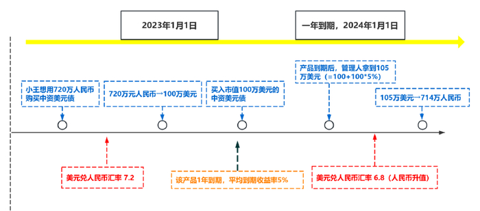 2024年1月1日产品到期,那么在不考虑管理费等其他成本的简单假设下,管理人拿到105万美元。此时人民币升值,美元兑人民币的汇率是6.8,那么换回人民币等值于714万人民币(105万美元*6.8),不仅没有赚到钱,还比初期投入的本金损失了6万左右。