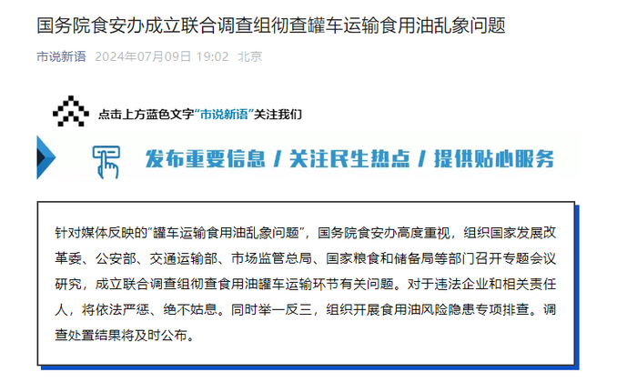 国务院食安办将彻查“罐车运输食用油乱象问题”!多家企业回应