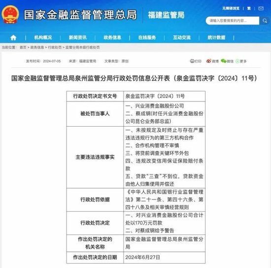 按照《中华人民共和国银行业监督管理法》第二十一条、第四十六条、第四十八条及相关审慎经营规则,监管部门对兴业消费金融合计处以170万元罚款,并对时任兴业消费金融昆仑业务部总监蔡成钢给予警告。