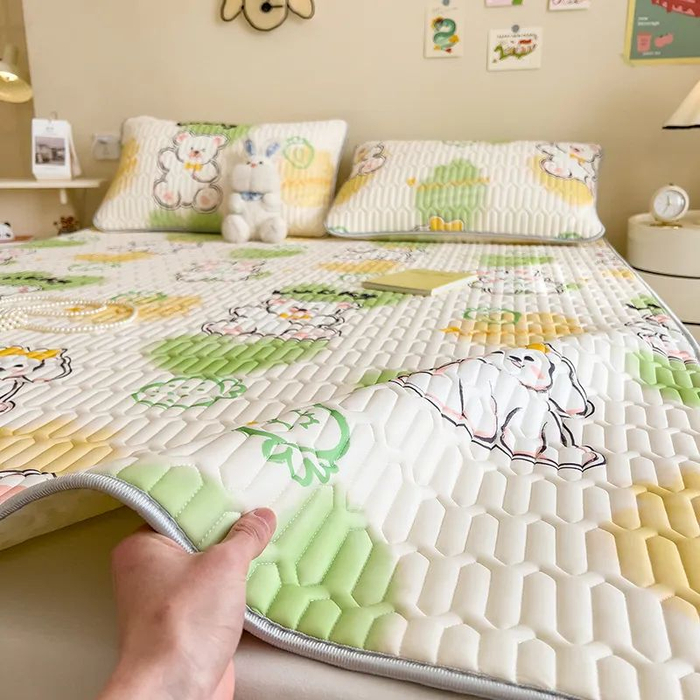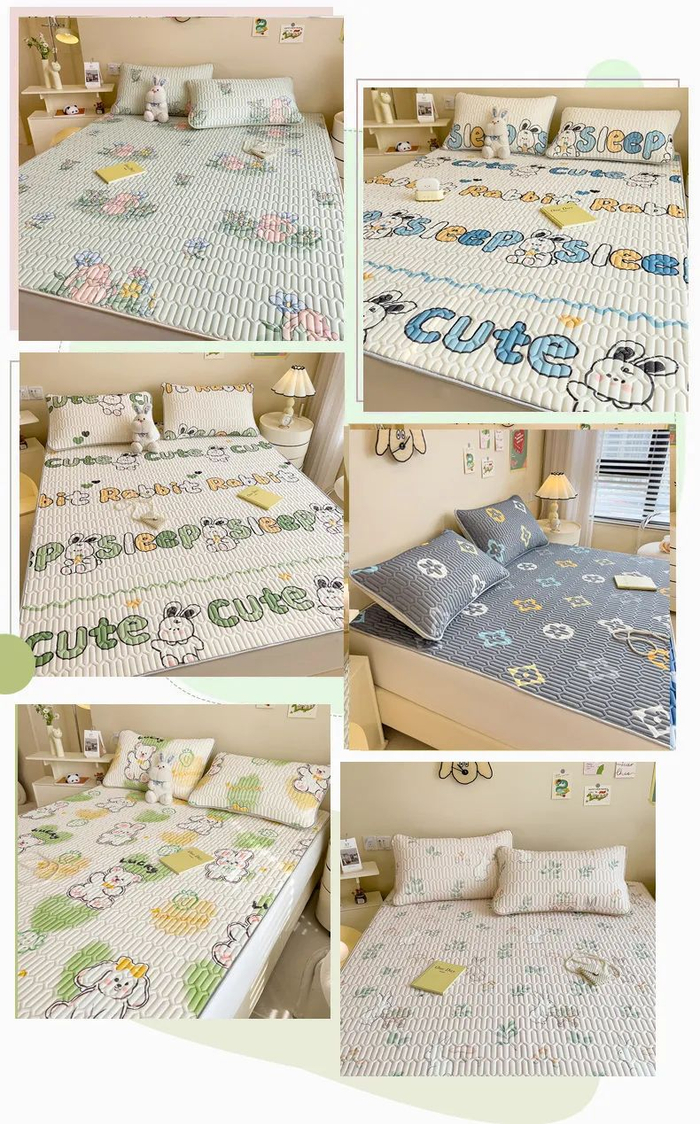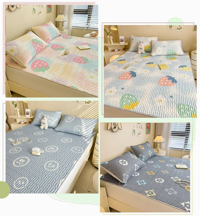 反面有防滑颗粒+松紧绑带设计,可以固定在床的四角,铺上=死死扒牢在床上,你随意打滚,它都不容易移位。