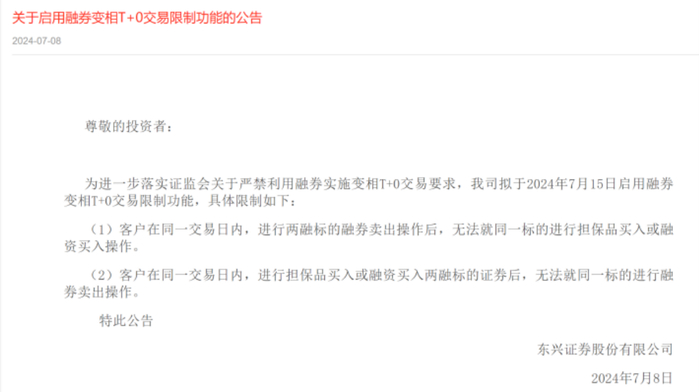 7月9日,有投资者称,收到东兴证券通知,将于7月15日起,启用融券变相T+0交易限制功能。据证券时报·券商中国记者了解,前一日,东兴证券就已在官网发布相关通知。