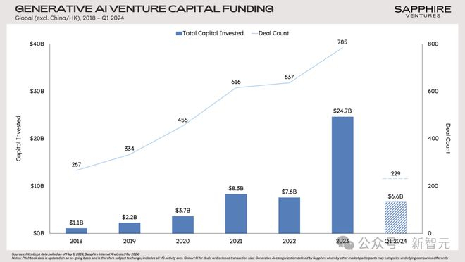 根据Sapphire Ventures的数据,GenAI领域从2022年到2023年迎来了爆发式的增长,全球范围(不含中国)的风投资金总量从76亿美元陡增到247亿。
