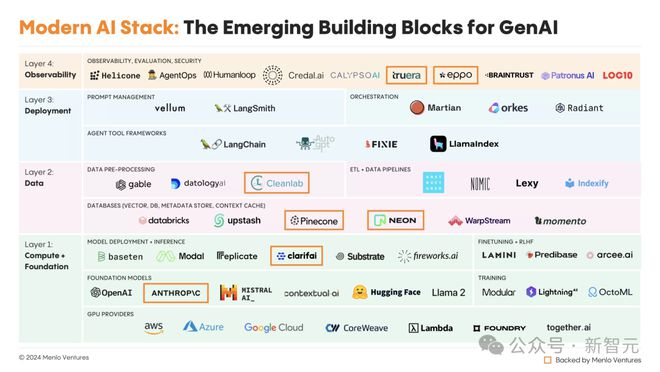 今年1月,Menlo Ventures对于现代AI技术栈的定义还是一个简洁的四层框架,从算力和基础模型开始,到数据、模型部署,以及最顶层的模型可观测性。