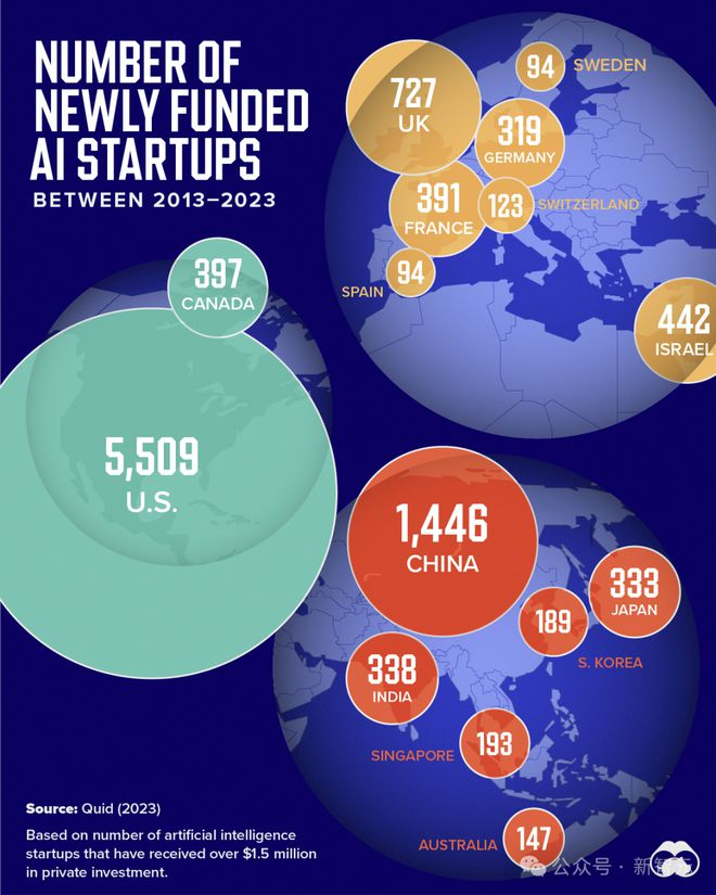 投资大量涌入,带来的直观结果就是初创公司如雨后春笋般涌现。从美国、中国到英国、以色列,都成为了AI创新的重要源头。