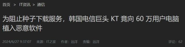 韩国有家电信巨头企业被曝出,为了不让用户用种子( BT )下载服务,直接给 60 多万个用户的电脑里植入了恶意软件。