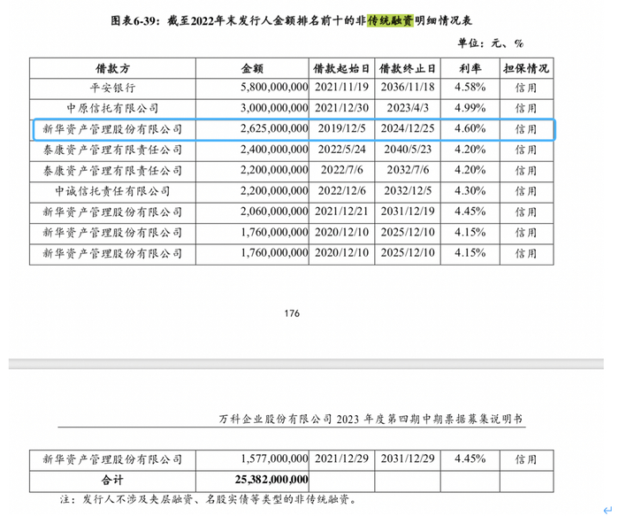 除了公开市场债务融资工具,万科还有部分非标债务。根据万科《2023年度第四期中期票据募集说明书》,截至2022年末,万科金额排名前十的非传统融资合计253.82亿元,涉及平安银行、中原信托有限公司、新华资产管理股份有限公司等多家企业。其中,新华资产管理股份有限公司的一笔26.25亿元的借款将于2024年12月到期。