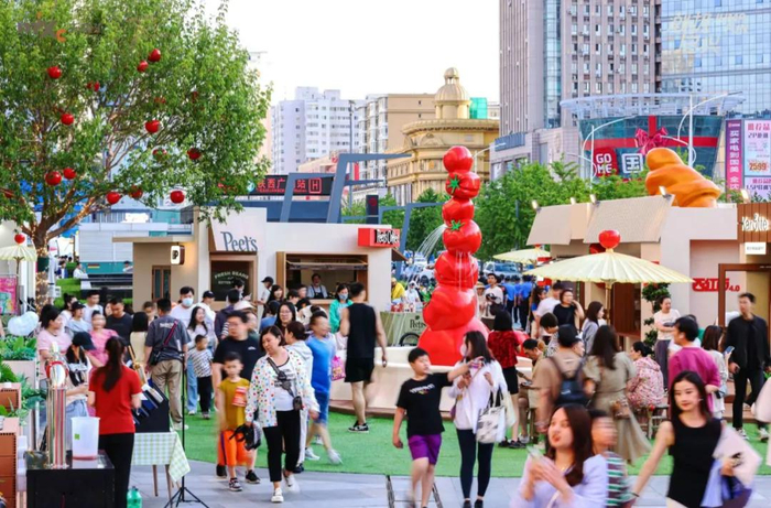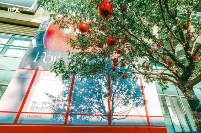 作为沈阳首个新中式主题街区,西红市4.0在水泥钢筋的城市街道上打造出了一棵“西红柿子树”,洒下一片盛夏阴凉,为消费者带来视觉上的全新体验。