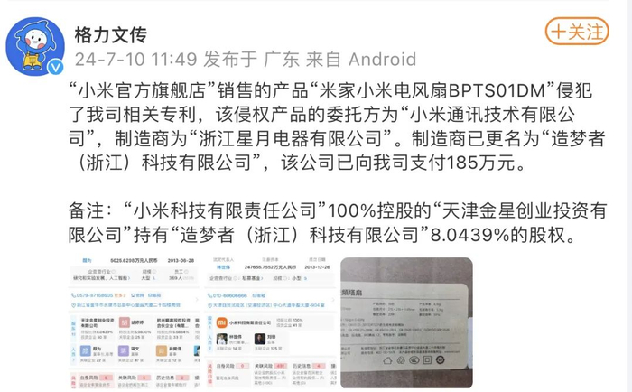 随后,格力文传也进一步回应,释放出了更多细节:“小米官方旗舰店”销售的产品“米家小米电风扇BPTS01DM”侵犯了格力电器相关专利,该侵权产品的委托方为“小米通讯技术有限公司”,制造商为“浙江星月电器有限公司”。制造商已更名为“造梦者(浙江)科技有限公司”,该公司已向格力电器支付185万元。