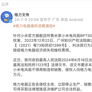 7月9日晚间,格力文传(珠海格力电器股份有限公司文化传媒中心官方账号)发文称,“针对小米官方旗舰店所售米家小米电风扇BPTS01DM侵犯我司专利权案,2022年12月22日,广州知识产权法院做出一审判决【(2021)粤73知民初1399号】,判决其行为已经构成侵权,并赔偿格力电器经济损失和维权费用。”