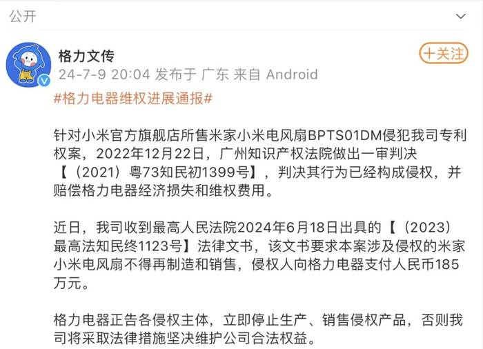 根据该文内容,近日,格力电器收到最高人民法院2024年6月18日出具的【(2023)最高法知民终1123号】法律文书,该文书要求本案涉及侵权的米家小米电风扇不得再制造和销售,侵权人向格力电器支付185万元。格力电器正告各侵权主体,立即停止生产、销售侵权产品,否则将采取法律措施坚决维护公司合法权益。
