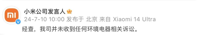 7月10日,小米公司发言人在微博上回应称,“经查,我司并未收到任何环境电器相关诉讼。”