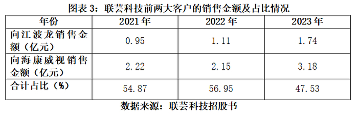 综合来看,报告期各期,联芸科技向海康威视、江波龙合计销售额占比分别高达54.87%、56.95%、47.53%。
