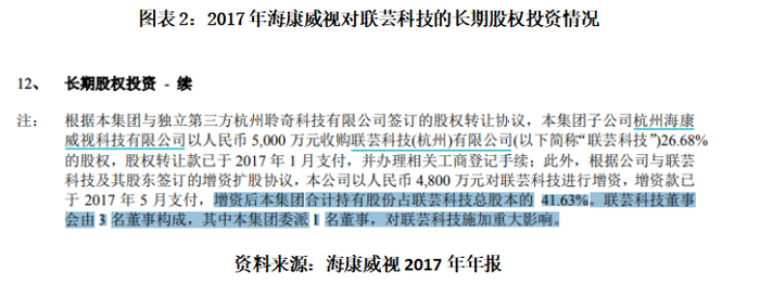 在2017年年报中,海康威视披露了对联芸科技的长期股权投资事宜。2017年5月增资后,海康威视合计持有联芸科技41.63%的股份,并委派1名董事,对联芸科技施加重大影响。