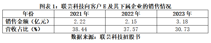 报告期内,客户E及其下属企业均为联芸科技第一大客户,各期销售金额分别为2.22亿元、2.15亿元、3.18亿元,占营收的比例分别为38.44%、37.57%、30.73%,均超过30%。