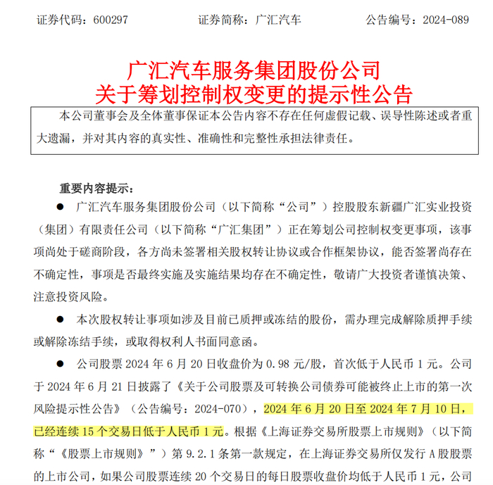 7月10日晚间,广汇汽车公告称,公司7月10日收到广汇集团发来的《关于正在筹划广汇汽车控制权变更有关事项的通知》,目前广汇集团正在与新疆金正新材料科技有限公司(简称“金正科技”)筹划公司股权转让事宜,此次交易可能触发公司控制权的变更。